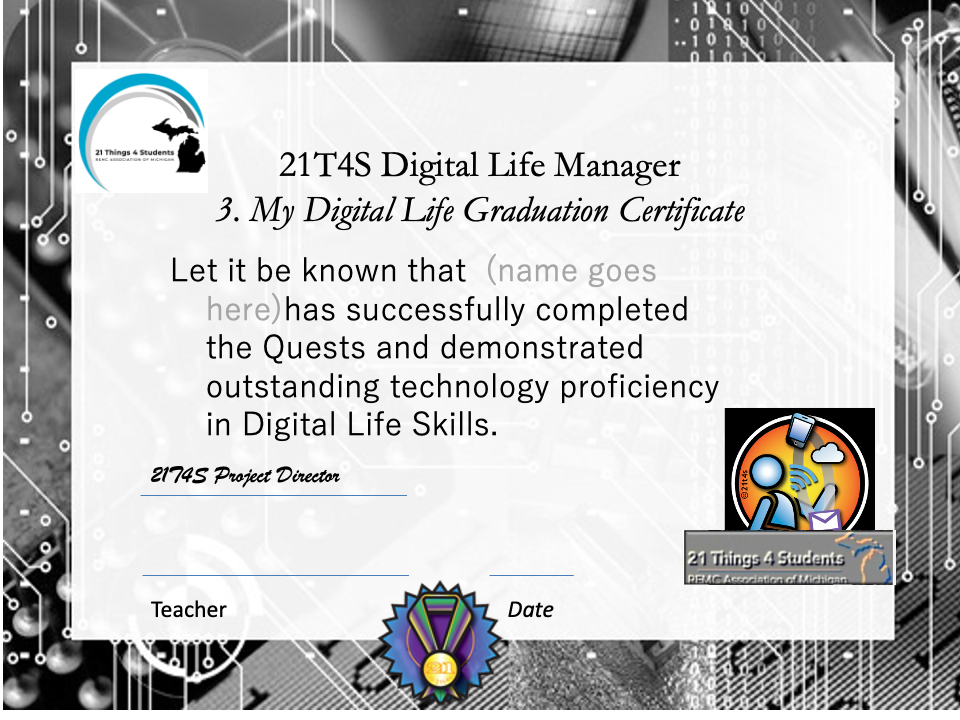 Now that you have shown mastery of the learning objectives by completing the activities in the assigned Quests, you will do the following to receive your My Digital Life Badge or Certificate.