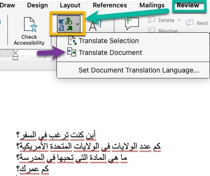 Step 2. Select the REVIEW MENU, use the drop-down menu next to the Translate icon, and select the language and select Translate Document.