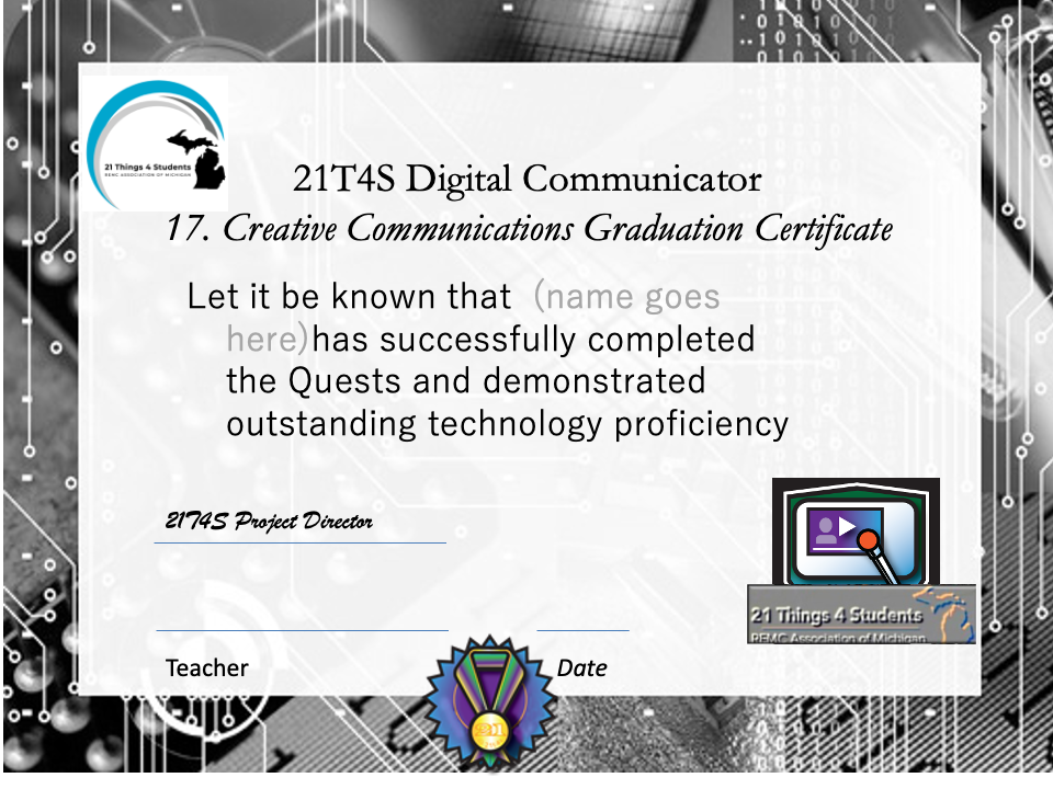 Now that you have shown mastery of the learning objectives by completing the activities in the assigned Quests, you will do the following to receive your Creative Communications Badge or Certificate.