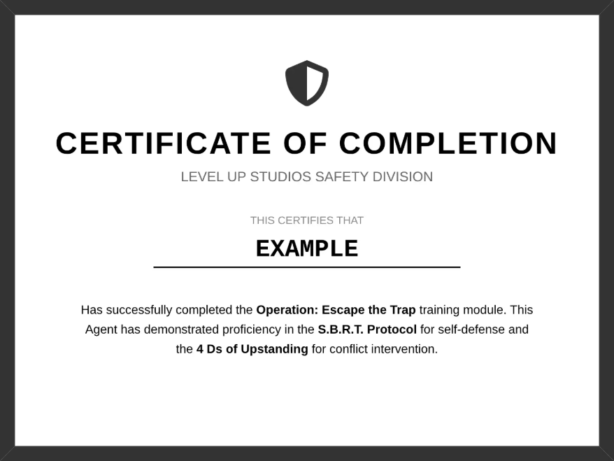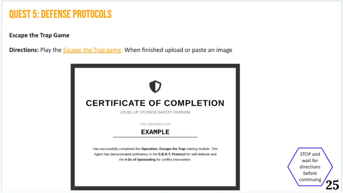 Step 3. Insert the certificate image into your Player Conduct and Safety Portfolio on the Quest 5: Defense Protocols slide.